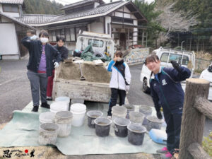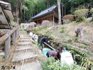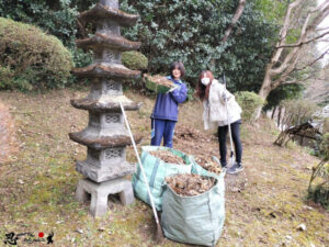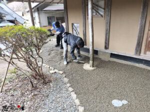 周辺の環境整備に加え、高台にある茶室の庭へ砂利敷きのお手伝いをしていただきました。