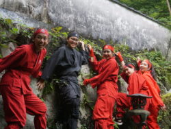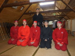Very cute and charming girls came to us. They started putting on ninja costume. They changed into charming kunoichi (femail jinja). They went to the 3rd floor where the ninja training room was located. The 1st training started with the training of greeting and how to receive sword. After those, underfloor penetration and blowgun training was conducted. And then they went to outside to the garden, and training of sword and ninja star (shuriken) were performed. It was so muggy (humid), but the charming ninjas completed hard & severe training without any issue / problem. Good job done!!! (Hiroyuki)