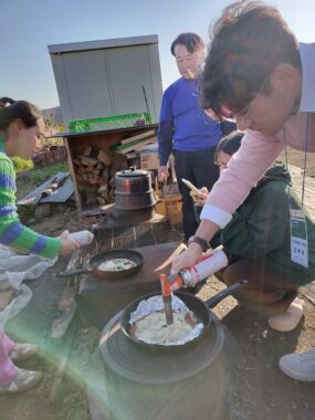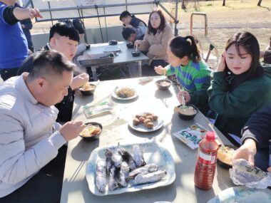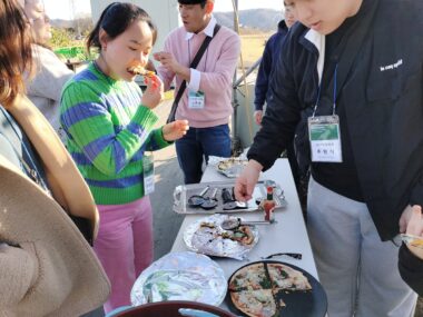 12月16日(火)韓国農業大学校から教授、学生12名が視察研修に来園されました。有機無農薬栽培の実践農家の視察だそうです。教授はEM農法も学ばれているとのことで、熱心に農園を見学していました。学生も、大変意欲的で、質問もたくさん出ました。そして、農園野菜を使った料理が大好評!「和風田舎風鍋うどん」と焼き芋、そしてマイピザ作り。どれも盛り上がっていました。農業、食料は人間にとって共通テーマなので、このような交流はとても有意義に感じました。心もお腹も満腹になって帰って行かれました。